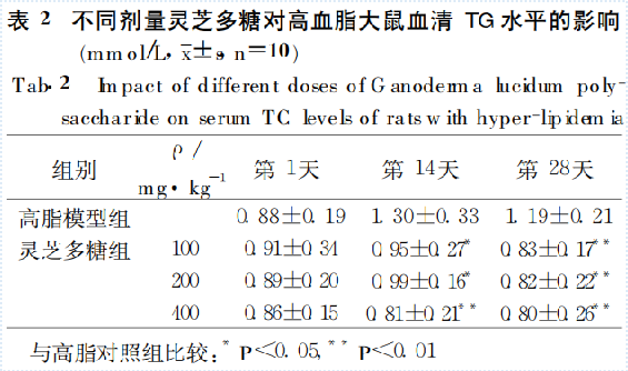 研究表明,灵芝多糖在100mg/kg的胃肠道灌胃剂量下,经14d可明降低高血脂动物血清三酰甘油的含量,经28d可明显降低动物血清三酰甘油、总胆固醇和低密度脂蛋白胆固醇的含量,在灌胃剂量达到 200mg/kg时,经28d可以极显著地降低高血脂动物的血清三酰甘油和低密度脂蛋白胆固醇;对血清高密度脂蛋白胆固醇的升高也有明显的调节作用。结果表明,灵芝多糖具有降低高血脂动物血脂的作用。
