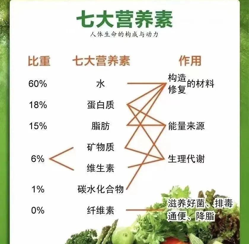 我们都知道,人体必须的七大营养素是:蛋白质、维生素、矿物质、碳水化合物、脂肪、纤维、水。人们必需全面、足量而均衡的摄取这些营养才会健康。